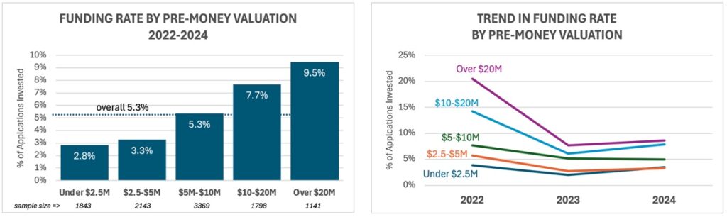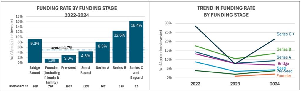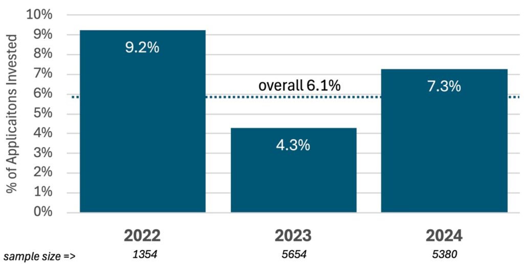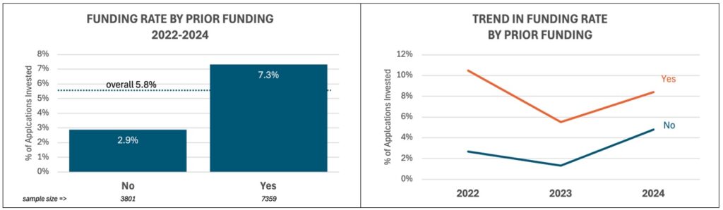 Another point of validation that increases funding rates is whether there has been at least one prior funding round. Companies with prior funding receive investment 7.3% of the applications, compared to 2.9% when there is no prior funding.