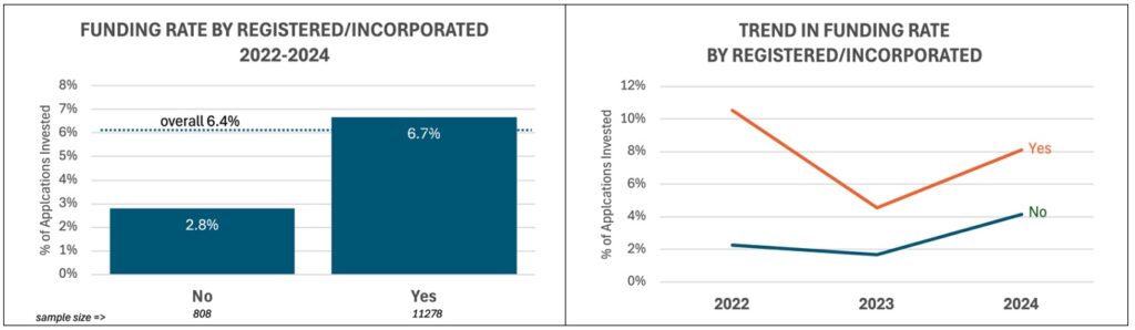 An overlooked factor is whether the company has already been registered and incorporated at the time of the application. When companies have not yet taken that step, they receive funding only 2.8% of the time compared to 6.7% for those already incorporated. Lack of registration may suggest that the company is less mature at the time of application, since obviously all companies are registered by the time they close on their funding. Thankfully, 93% of the companies were registered at the time of application. But any company not getting this done before they start raising money is hurting themselves by reducing their prospects for funding.