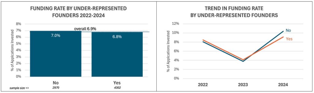 Finally, it is encouraging that investors seem to be blind about whether or not the founders include under-represented minorities. The funding rate is nearly identical at 6.8% for those with under-represented founder compared to 7.0% for those without under-represented founders.