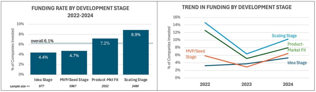 Next, let’s look at the development stage of the company. Again, the funding rate increases as companies progress through the stages of development. While the funding rate is only 4.4% for companies in the idea stage, it grows a little in the MVP/Seed Stage to 4.7% before rising to 7.2% in the Product/Market Fit stage and then 8.9% in the scaling stage.