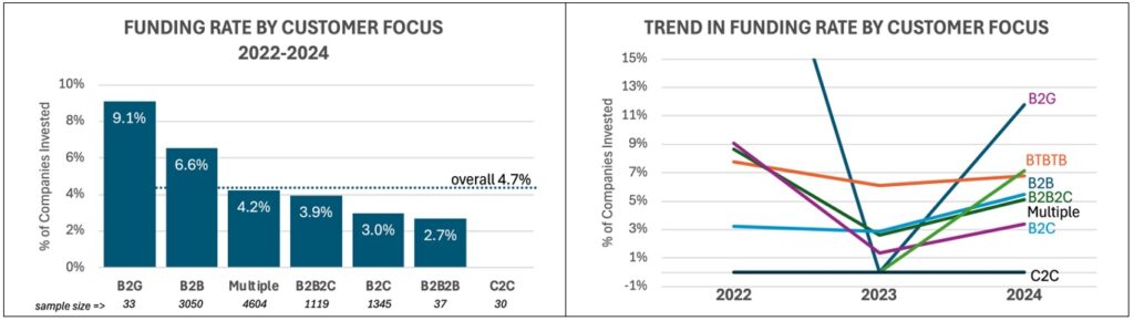 But what about the Go-To-Market strategy? Funding rate is highest for B2G (Business-To-Government) businesses, perhaps due to relative stability in the needs and channels to reach those customers and in some cases early customer adoption; however, due to recent abrupt changes to procurement in DC that stability may not be true moving forward. B2B businesses have the next highest funding rate at 6.6%. At the low end is B2C businesses – most likely due to the limited upside in terms of exit values in those types of businesses coupled with potentially high customer acquisition costs relative to lifetime value.