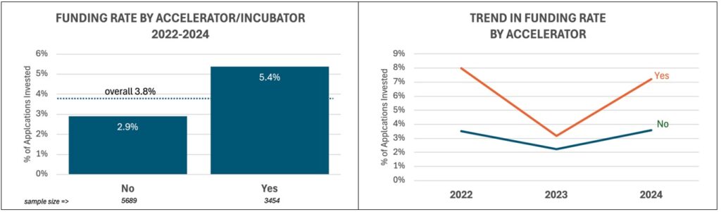 It seems to help if the company applying for funding is a graduate of an accelerator or incubator. For those companies, the funding rate is 5.4% compared to 2.9% for those companies that have not been through such a program. Part of this is likely due to risk reduction and polishing the investor pitch, and part may be due to help that accelerators may provide in opening up doors to potential investors.