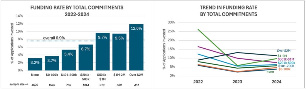 The funding rate consistently increases the larger the commitments which are disclosed at the time of application. Companies with no commitments are only being funded 3.2% of the time and this steadily rises to 12% for companies with more than $2 million in commitments. Commitments signal both validation by other investors and less risk that the round will realize sufficient funding. Commitments in the current round also may be a signal that the company is in an attractive enough space that follow-on funding is more likely to be available once milestones are achieved — meaning financing risk may be perceived as lower.