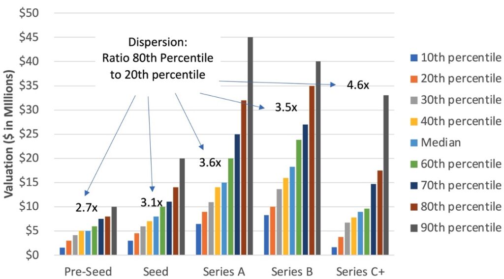 First of all, while medians are the best single way to measure valuations, the dispersion in terms of percentiles is also revealing. Valuations do tend to increase by round, but the dispersion also increases, with the ratio of the 80th percentile compared to the 20th percentile ranging from 2.7x in Pre-Seed to 4.6x in Series C+: