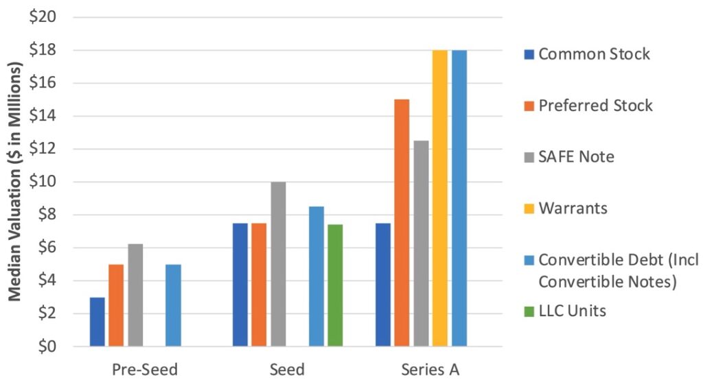 In terms of type of security, SAFE Notes captured a premium valuation in Pre-Seed and Seed, perhaps due to the use of SAFE signaling more bargaining power on the company side. However, this premium for SAFE’s went away in Series A deals: