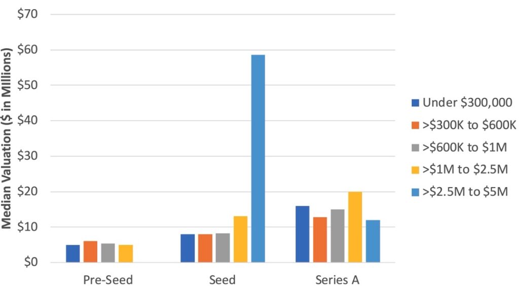 At the very high end of valuations, there are some outliers and these are ignored by appropriately focusing on median and percentiles. But the highest valuations in any stage of investment are truly extraordinary, and one wonders for example how any Pre-Seed deals can be valued as high as $30 million and how any Seed deal can be as high as $108 million: