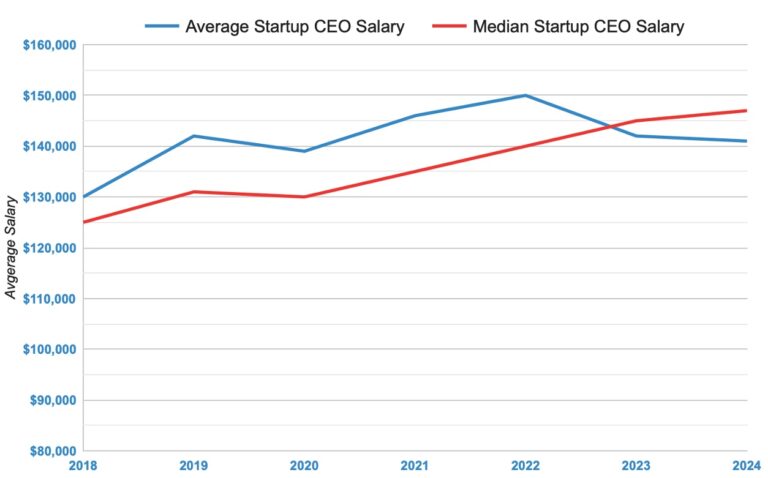 Early-stage salaries remain very low versus the corporate world – and first-year graduates from Harvard Law School. The average startup CEO salary in 2024 was $141,000, down slightly from 2023’s $142,000. This decrease is probably not statistically significant. In fact, you could throw a hat over all these numbers. Salaries have increased only about 1.4%/year – a total of 8% since 2018. Kruze points out that follow-on fundraising has been difficult and that CEOs may have cut salaries, including their own, to keep their companies afloat. As perspective, the average Seed CEO salary increased slightly from $129,000 to $132,000 whereas Series B CEO salaries decreased from $251,000 to $227,000. There has been very little change in average salaries over the last six years, although median salaries are trending upward; median is the point at which half the numbers are above and half are below median salaries, and this inched up by 1.4% from $145,000 in 2023 to $147,000 in 2024.