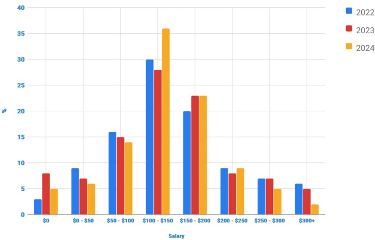 Fewer CEOs and founders are paid less than $100,000 or more than $250,000. Kruze believes the reduced number below $100,000 is because of the number of startups that have recently gone out of business. Only 13% of startups where the CEO drew a $0 salary in 2023 are still in operation in 2024.
