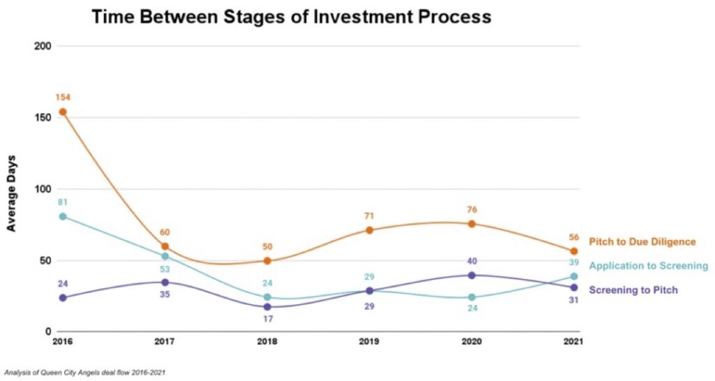A second graph (below) indicates the number of companies at all stages of the pipeline has remained constant or increased over the study period. Thus, the increased speed of execution has not come at the expense of having fewer companies in the pipeline. Clearly, the increased member engagement has had a very positive effect on QCA’s ability to consider more companies for investment and to do it faster.