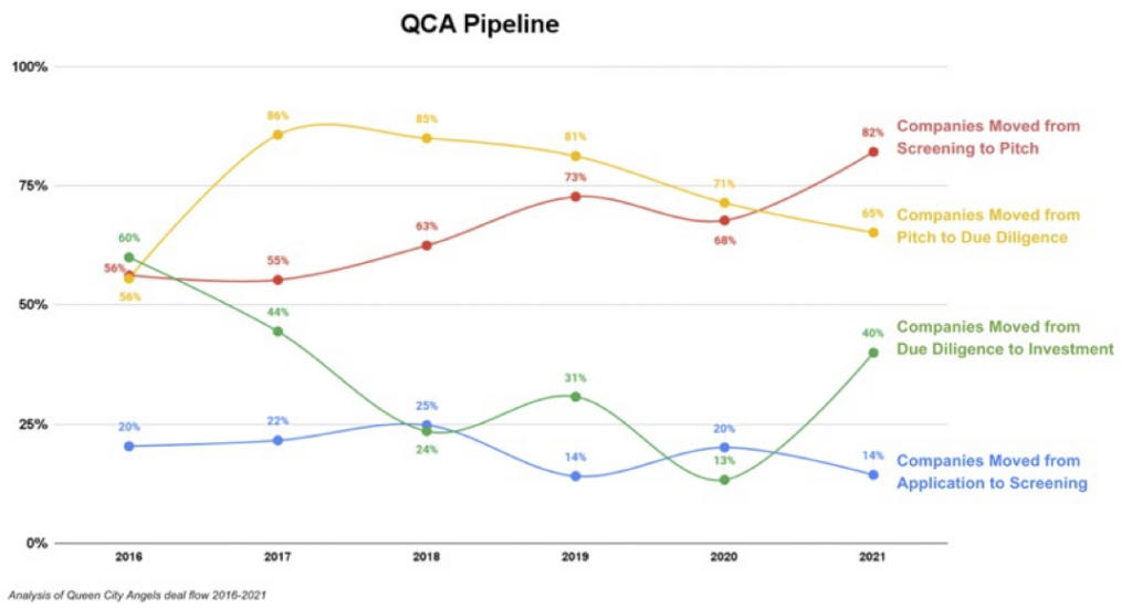 The initial data analysis (shown in the graph below) illustrates the QCA “deal pipeline” for the study period, i.e., those companies who applied for funding from QCA and progressed toward an investment. More specifically, we considered a year-by-year comparison of the number of companies that: