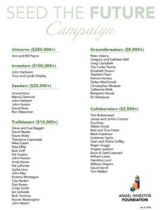 Thank you to the individuals and Angel Groups who have supported the Seed the Future Campaign. We sincerely appreciate your generosity and investment in the next generation of entrepreneurs. With your help, AIF is advancing the art and science of angel investing to accelerate innovation and economic growth.
