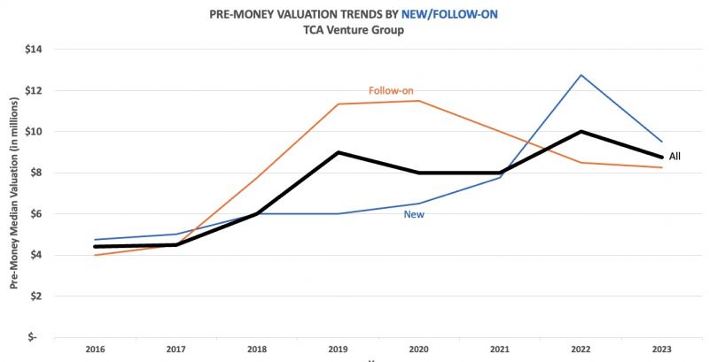 In 2023, TCA VG did not see much difference in medians for new vs follow-on rounds. This is partly due to follow-ons often being priced close to previous rounds in order to attract funding in this tough market: