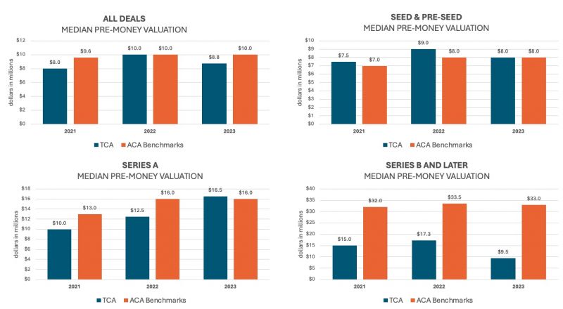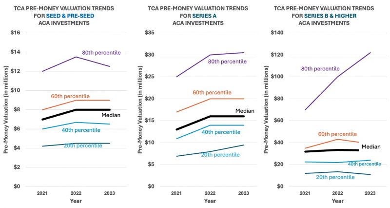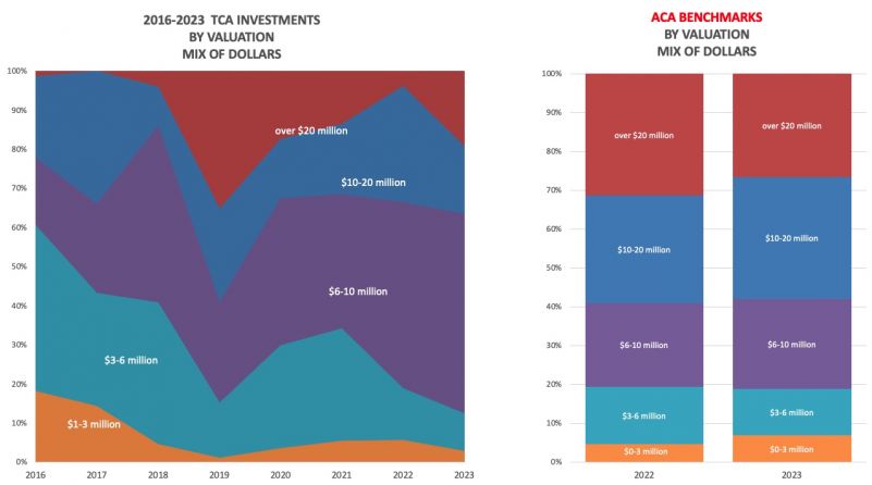To understand this elevation in earliest stage deal valuations, let’s look at longer trends going back to 2016. In that year 18% of valuations of TCA funded companies were in the $1-3 million range, but by 2023 this dropped to only 3%. Also in 2016, valuations in the $3-6 million range comprised 42% of funding, yet by 2023 that has dropped to 10%. The recent data from ACA for all Angel Groups shows a similar recent pattern, with only 7% in the $1-3 million range and 12% in the 3-6 million range: