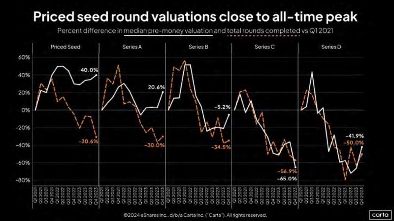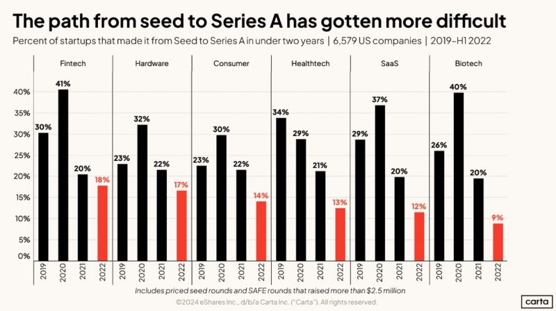 As evidence of the tougher funding environment, recent analysis from Carta shows that it is much harder for companies to progress to Series A funding, and some of this is because of the too high valuations of seed rounds: