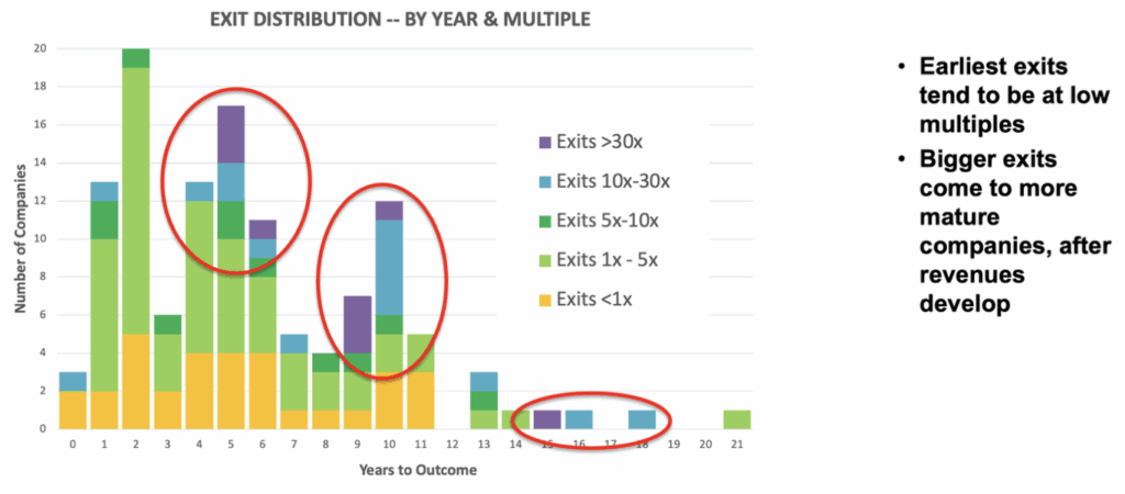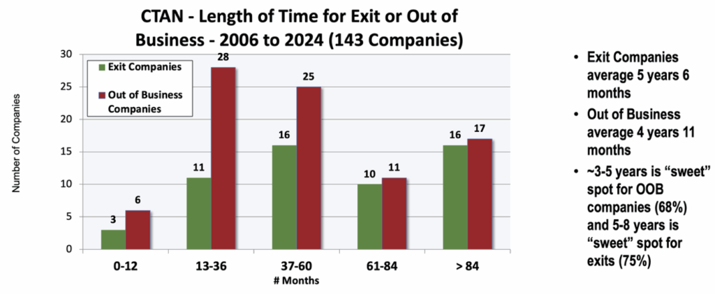 The TCA Venture Group chart correlates exits with length of time held, showing that the largest exits taking more time. The CTAN chart plots the timing for out of business and exits of their 143 companies, noting that 3-5 years is the “sweet spot” for out of business companies and 5-8 years is the “sweet spot” for exits.