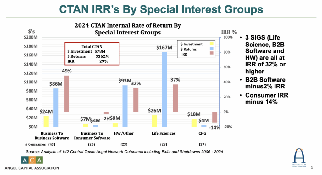 Source: Analysis of 142 Central Texas Angel Network Outcomes including Exits and Shutdowns 2006 – 2024
