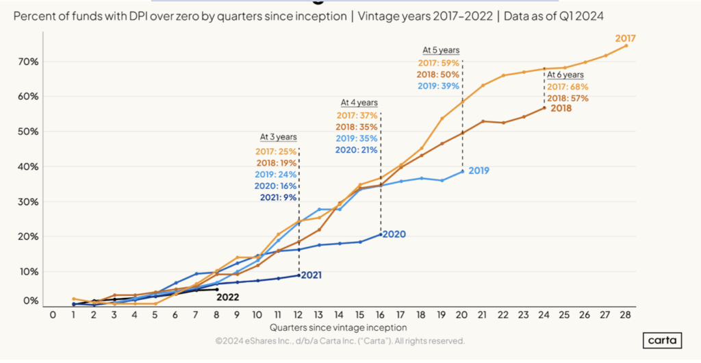 Carta also did some DPI research on about 1,800 funds and different vintages to compare fund performance, and they found that earlier vintages were performing much better in the earlier stages of the funds’ life than compared to recent vintages. For a 2017 vintage, about 25% of funds had generated DPI after 3 years, but for a 2021 vintage, that number drops down to only 10%.